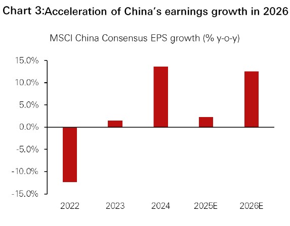 • China’s Central Economic Work Conference (CEWC) 2025 reaffirmed policy priorities centred on innovation-driven structural growth, industrial upgrading and a revival in domestic demand through consumption and investment. With a significant EPS growth projection for 2026 (12.5%) and undemanding valuations at 12.3x forward P/E with a ROE of 11.2%, we remain positive on Chinese equities. Our investment approach balances exposure to AI themes and innovation leaders, with high-dividend, quality companies that benefit from both cyclical drivers and structural policy tailwinds.