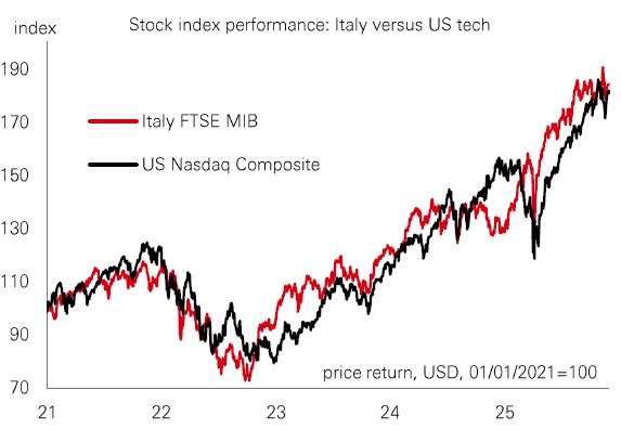 Italy’s good progress in improving its fiscal position and building a more stable political climate is a positive development for an economy traditionally known as “the sick man of Europe”. Even though this title could now arguably be applied to Germany, Italy’s growth remains chronically weak. However, the same cannot be said of its equity market performance. Despite all the hype surrounding tech and AI, Italy's FTSE-MIB has quietly outperformed the US Nasdaq year-to-date. This is not a one-off – since the start of 2021, Italian stocks have matched US tech sector gains. The drivers behind this are largely rooted in sector composition, with Italy's FTSE MIB dominated by banks, energy, and industrial cyclicals, all of which were relative winners in a regime of higher interest rates and inflation, and commodity price volatility. Lower government bond spreads have also contributed to boosting stock multiples. |