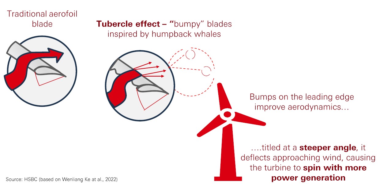 By incorporating into wind turbine blades, a design similar to tubercles (bumps the size of golf balls) found on humpback whales, engineers can reduce drag as it allows the blades to spin faster with less resistance, generating 10% more electricity.[@why-esg-matter-01-1] [@why-esg-matter-01-2]