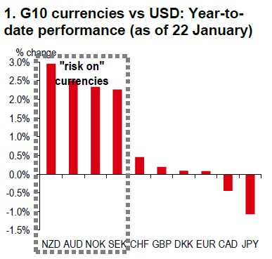 Meanwhile, “risk-on” currencies − AUD, NZD, NOK, and SEK – have outperformed other G10 currencies year-to-date, each posting notable gains against the USD (see Chart 1). Their outperformance appears to be somewhat supported by a favourable global risk environment, with international equities (excluding the US) outperforming the S&P 500 Index (Bloomberg, 22 January). Additionally, market sentiment might have improved following the recent easing of tensions surrounding US-EU trade issues related to Greenland.