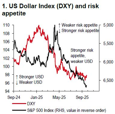 In the coming weeks, the USD looks set to be trapped, in our view. Factors, such as the still buoyant risk appetite (Chart 1) and continued concerns over the Federal Reserve’s (Fed) independence amid the US administration’s legal cases (Reuters, 23 September 2025) point to further USD downside, but this could be offset by cyclical upside risks, given that markets are priced more dovishly than what the recent Fed rhetoric would seem to justify.