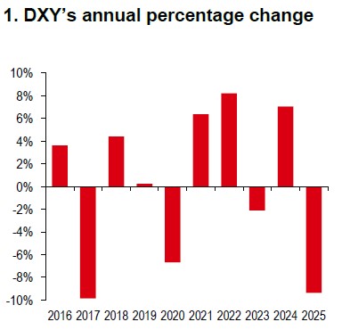 In 2025, the USD was the worst performing G10 currency, with the US Dollar Index (DXY) falling c9.4% − its largest annual decline since 2018 (Chart 1). As we look towards 2026, the outlook for the USD remains subdued, provided that global economic growth holds steady, the Federal Reserve (Fed) does not raise rates, and US financial conditions stay accommodative.