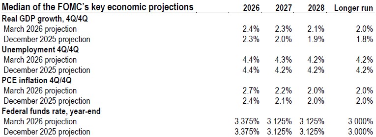 Similarly, the updated “dot plot” did not indicate a meaningful shift in policymakers’ views. The median 2026 policy rate projection, arguably the most relevant horizon for the USD, was unchanged at 3.375%, still consistent with just one cut this year (broadly in line with current market pricing). Our economists still expect the Federal Reserve (Fed) to keep the policy rate steady in 2026 and 2027. The macro projections saw only modest adjustments (see the table below), with the most notable change being an increase in the 2026 PCE inflation forecast to 2.7% (from 2.4%) − an unsurprising move given recent development.