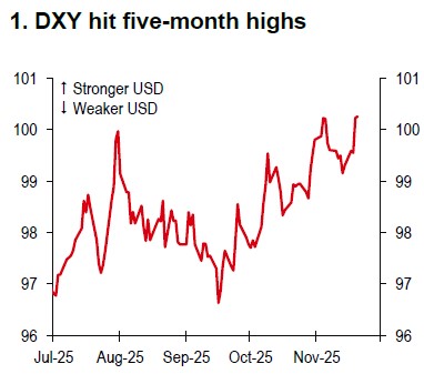 The US Dollar Index (DXY) has recently climbed above the 100 mark (Chart 1), prompting debate on whether the USD’s decline has ended and if an upward trend is imminent. In our view, further USD softness is likely, contingent on the Federal Reserve’s (Fed) upcoming decisions and the appointment of its new Chair.