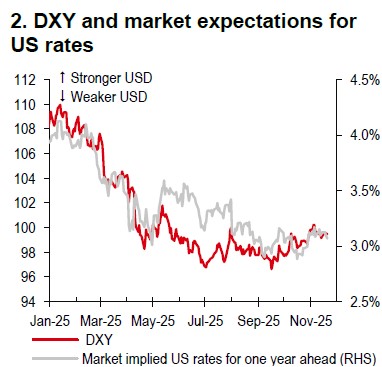 Looking ahead to 2026, the extent of the Fed’s rate cuts may be influenced by the selection of the next Chair. Recently, US President Trump has indicated he has identified a candidate for the Fed Chair position, and Treasury Secretary Scott Bessent, overseeing the selection process, aims to finalise it next month (Bloomberg, Fox News, 19 November). The eventual appointee is unlikely to trigger a significant hawkish market repricing (Chart 2),which may keep the USD defensive. Concerns about Fed independence may also heighten, potentially extending and exacerbating the USD’s decline into next year.