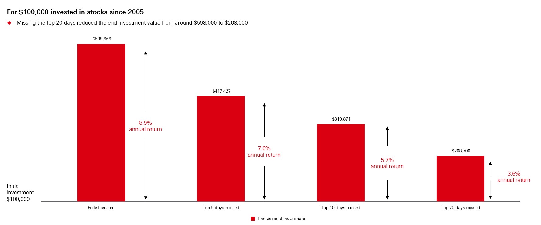 Don’t be passive in the face of market declines. When market sentiment is low, valuations tend to be driven down which provides investment opportunities. In rising markets, people tend to invest as they chase returns, while in declining markets people tend to sell. When investors overreact to market conditions, they may miss out on some of the best-performing days.