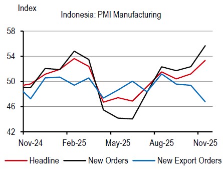Having said that, the recent policy softening is clear. Bank Indonesia’s (BI) policy rate has been cut by 150bp in this cycle, and a string of fiscal stimuli have been announced through 2025. Indeed, recent data shows that domestic demand has started to improve. The latest PMI details show that new domestic orders are growing faster, even though new export orders are not. Other indicators, like consumer sentiment and truck sales, also point towards an improvement in activity.