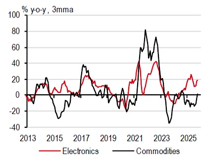 Similar to other tech-exposed economies, Vietnam has also benefitted from surging AI-driven demand. In particular, its electronics exports to the US alone jumped 150% y-o-y on a three-month moving-average (3mma) basis, pushing Vietnam’s total exports to the US up by 30% y-o-y.