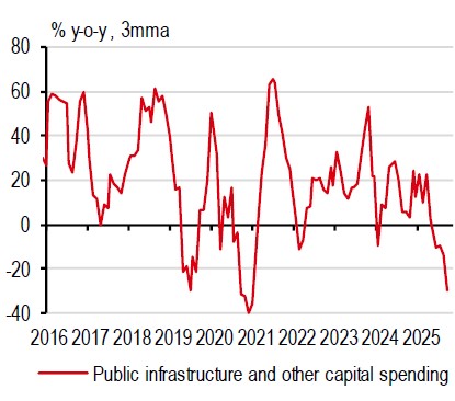 Amid all the uncertainty in politics and policy, growth disappointed in the third quarter of 2025, falling by 0.6% q-o-q seasonally adjusted. Services exports continued to contract with the tourism sector still finding its feet after its stumble earlier in the year. Meanwhile, passing the baton from one Prime Minister to another was a two-month process, which eventually led to fiscal standstill. Government spending fell, dragging growth down by as much 1.1ppt.