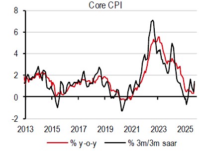 Given the large 3Q25 upside surprise, we have recently raised our GDP growth to 4.1% for 2025, from 2.8%. This puts our forecast slightly above the government’s forecast of “around 4%”, which has been raised from “ 1.5-2.5%” earlier. We have also recently raised our 2026 growth forecast to 2.0%, up from 1.7%. This would put us in the middle of the government’s forecast range of “ 1-3%”.