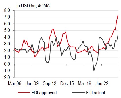The fiscal drag then had a domino effect on other aspects of the economy. The most important was private investment. For instance, business sentiment has fallen to its lowest level after the COVID-19 pandemic. Consequently, the share of firms which intend to expand their production in the following quarter has fallen to a post-pandemic low. Moving in parallel is a sharp decline in FDI applications. In all, we expect growth in 2026 and 2027 to come in below potential at 5.2% and 5.6%, respectively, with both private and government investment weighing on growth.