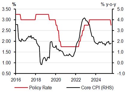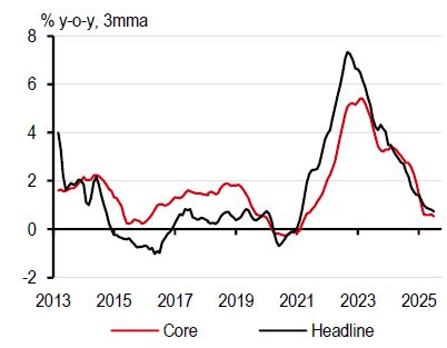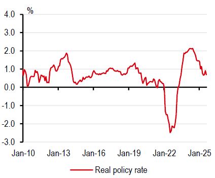 In addition, inflation remains well behaved, as headline CPI decelerated to 1.4% y-o-y y-t-d as of July. Given subdued inflation momentum, we recently lowered our headline inflation forecast to 1.5% (from 1.9%) for 2025 but kept our 2026 forecast at 1.7%.