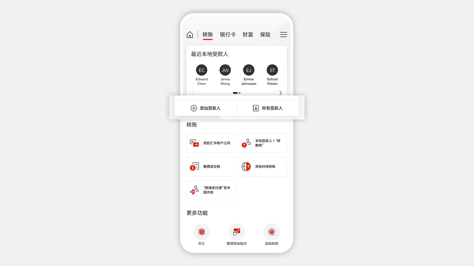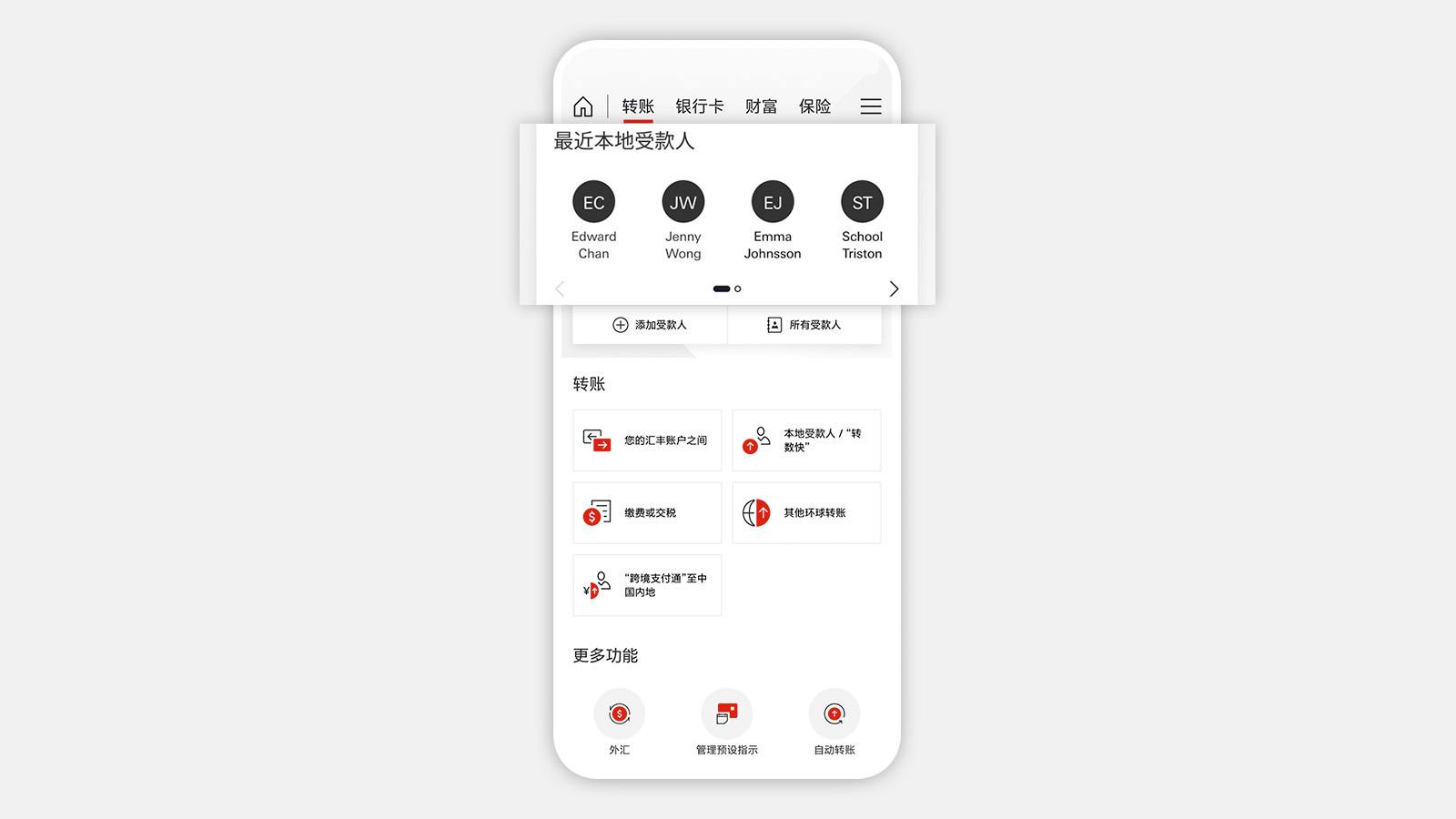 ”转账”页面经全新设计,让您可更容易找到所需功能,省时省工夫。