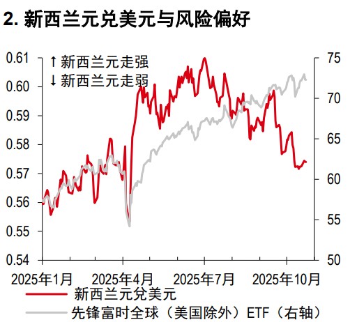 新西兰元一直受到严峻国内挑战的拖累。在新西兰储备银行 10 月 8 日降息 50 个基点(即 0.5%)后,市场已完全消化 11 月 26 日进一步降息 25 个基点(即 0.25%)的预期(彭博资讯,10 月 23 日)。汇丰的经济分析师也预期下月会议上将降息 0.25%,原因在于新西兰经济活动低迷、潜在通胀下降及就业市场仍然疲软,以致新西兰储备银行似乎不能不进一步降息。然而,由于许多国内问题已经反映在汇率中,同时风险偏好上升(图 2),如果我们对美元全面走弱的预期成为现实,新西兰元料将在未来几周出现盘整走势。