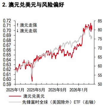 展望未来,澳元短期内将对全球风险情绪变化高度敏感(图 2)。澳元可能很难跑赢美元,但有望跑赢新西兰元。这得益于澳大利亚强劲的国内基本面,包括澳大利亚央行持鹰派立场、具备大宗商品敞口、经常账户赤字规模适度且资金缺口主要由外国直接投资和证券投资流入填补,同时债务占国内生产总值比重在十国集团经济体中相对较低。