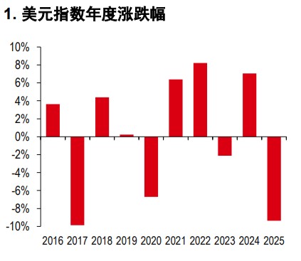 2025 年,美元成为十国集团中表现最差的货币,美元指数(DXY)累计下跌约 9.4%,创下自 2018 年以来最大年度跌幅(图 1)。展望 2026 年,若全球经济增长保持平稳、美联储不加息且美国金融环境保持宽松,则美元前景仍将维持低迷。
