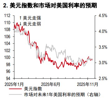 展望 2026 年,美联储降息幅度可能受到新任主席人选的影响。近期,美国总统特朗普表示他已经确定了美联储主席职位的人选,而负责遴选过程的财政部长贝森特(Scott Bessent)则希望在下个月敲定最终人选(彭博资讯、福克斯新闻,11 月 19 日)。最终的任命人选不太可能引发市场明显的鹰派重新定价(图 2),这或使美元保持守势。对美联储独立性的担忧也可能加剧,并可能使美元的下行走势延续至明年甚至进一步恶化。