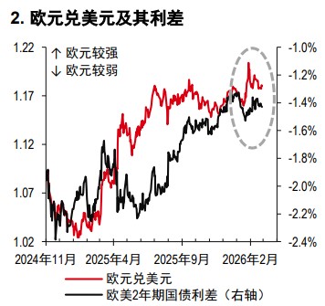 尽管欧美国贸易仍存在不确定性,但欧元兑美元保持稳定。由于立法者正在寻求美国贸易政策的更进一步澄清,欧盟可能推迟批准欧美贸易协议(彭博资讯,2 月 24 日)。由于欧元兑美元高于利差所暗示的水平(图 2),大部分美国政策风险似乎已被消化。短期来看,我们预计欧元兑美元将涨至当前区间上部,但是创出明显新高的可能性不大。在欧元区,财政扩张与经济复苏虽带来一定上行空间,但欧元若要大幅上涨,还需要更强劲的工资增长或明确的信贷周期提供支撑。欧洲央行的影响力仍然有限,预计 2026 年利率将保持不变(彭博资讯,2 月 24 日)。