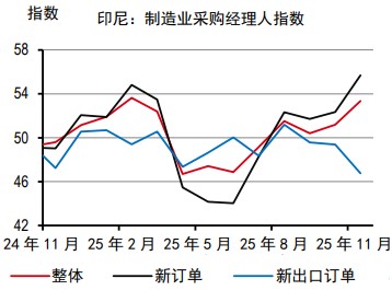 尽管如此,近期政策明显放松。印尼银行在本轮周期中已累计降息 150 个基点,并且在 2025 年宣布了一系列财政刺激措施。事实上,近期数据表明国内需求已开始改善。最新的采购经理人指数分项数据显示,国内新订单增速正在加快,尽管新出口订单并没有同步改善。其他指标(例如消费者信心和卡车销售)也指向经济活动回暖。