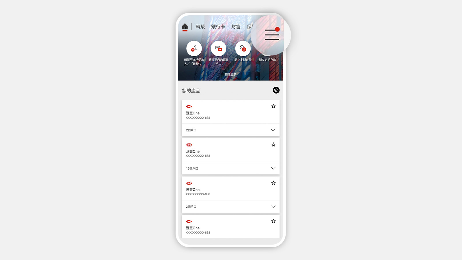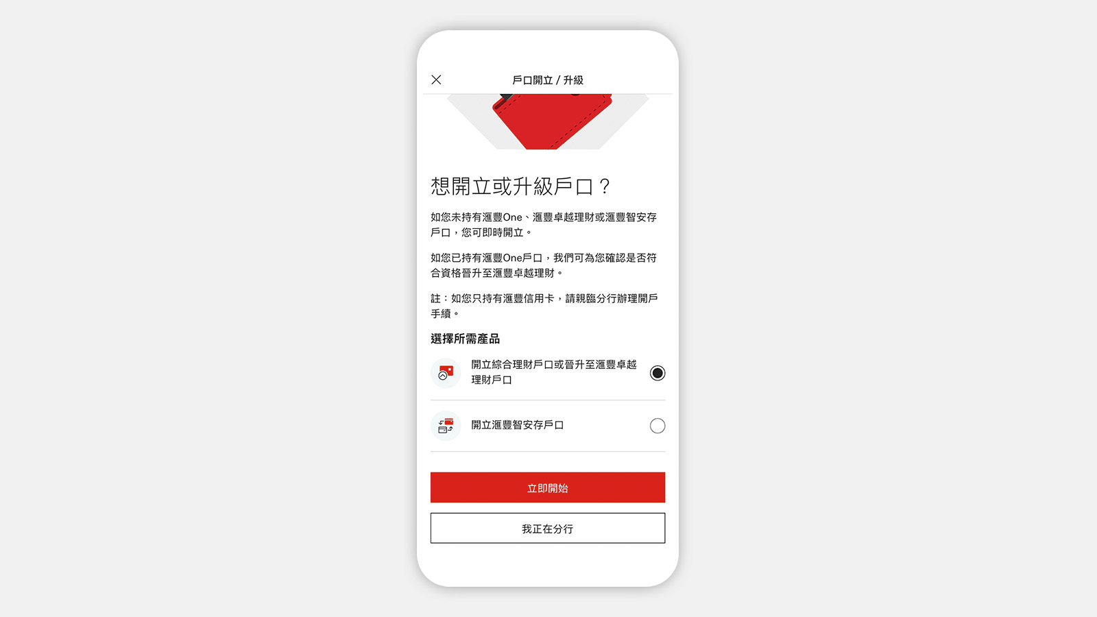 無論您是全新客戶,或由現有滙豐One、綜合理財或一般儲蓄戶口晉級,都可透過香港滙豐流動理財應用程式[@premier-apply-via-app],5分鐘內快捷開戶。