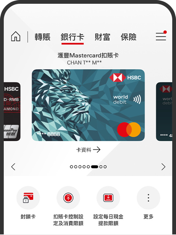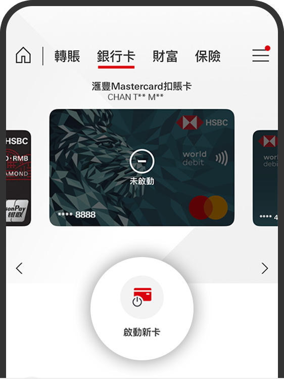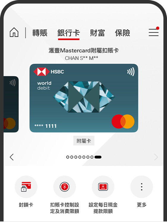 - 扣賬卡一經啟動,即表示您同意相關條款及細則,並接納啟動新卡信件上所列印的預設每日消費限額。在啟動該卡後,您可因應需要隨時登入HSBC HK app內的「管理扣賬卡」頁面或致電印在卡背的熱線號碼,調低該卡的消費限額。