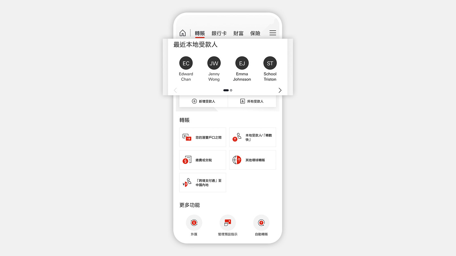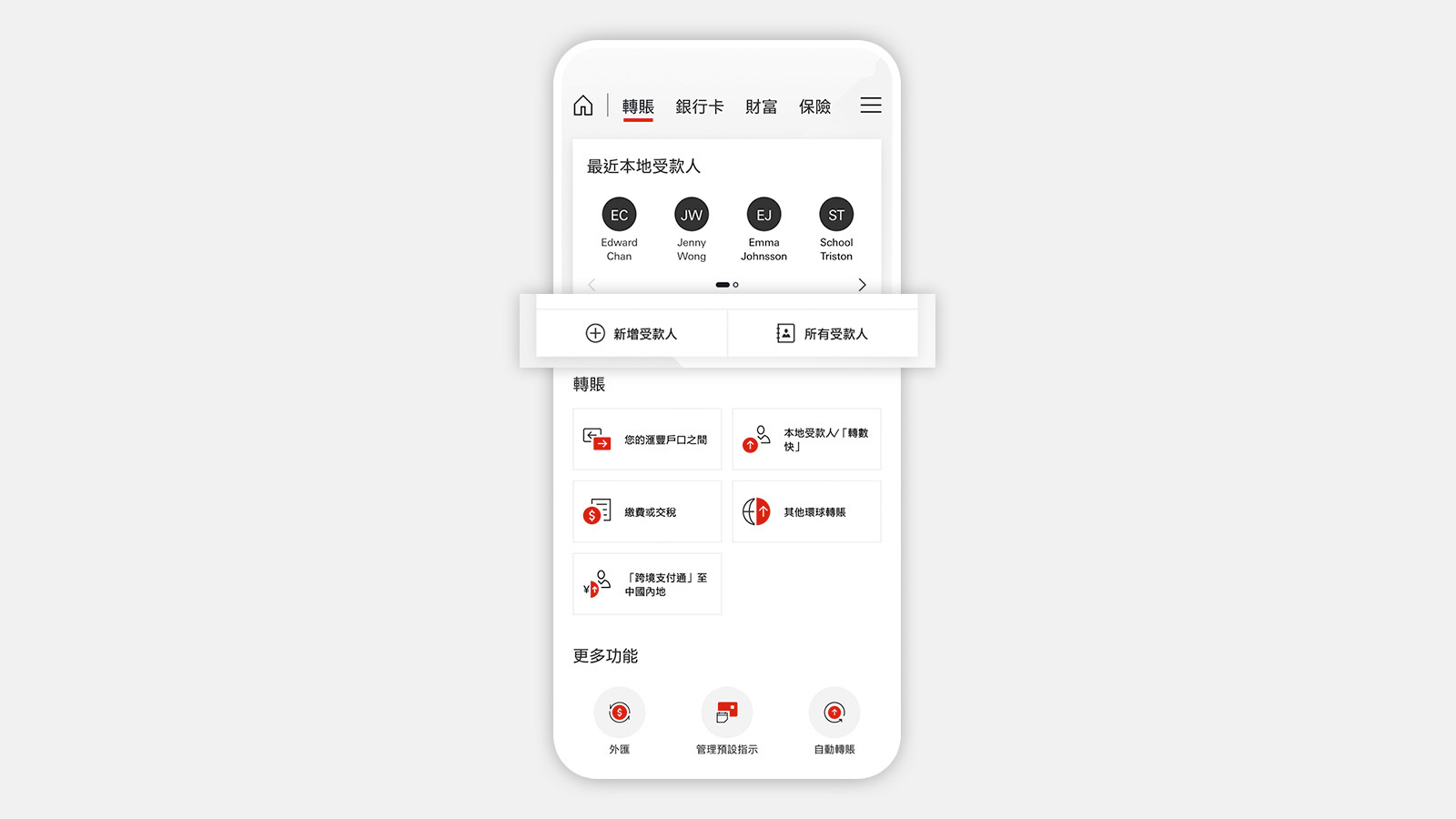 - 只須從列表點選受款人即可轉賬,提升理財效率