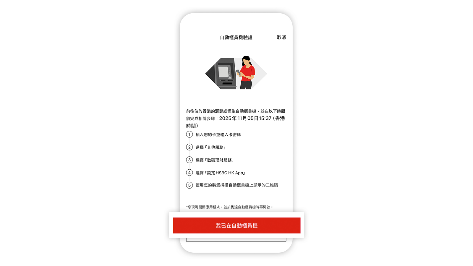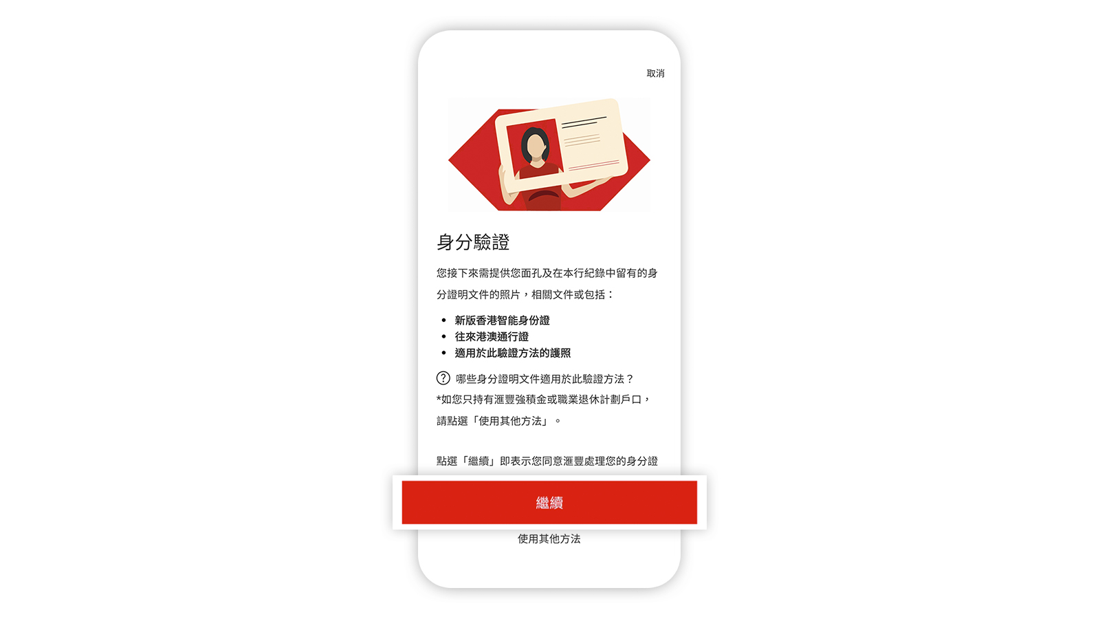 請注意,當您設定HSBC HK App後,您可能需要進一步驗證身分以使用滙豐網上及流動理財的全部服務。