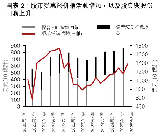 - 我們認為美國股市仍有進一步的上行空間,原因在於多重推動因素,而減息為其中之一。人工智能的迅速發展帶動整個人工智能生態系統內的活動及投資增加。基於併購活動回升、股票回購與股息穩步增長,以及樂觀的週期性展望與結構性推動因素,包括生產回流及美國再工業化,我們維持對美國股市的看好觀點,偏好資訊科技、通訊、工業及金融板塊。