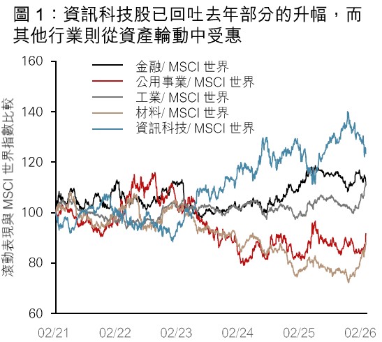 - 投資者擔心傳統軟件企業或被人工智能初創公司取代,導致市場近日出現拋售。然而,我們認為這些擔憂被誇大了,因為這些企業同樣可善用人工智能提升營運效率。資金由資訊科技輪動至其他行業,令投資機遇擴展至工業、材料及公用事業板塊。我們的多元資產配置方案有助分散於不同資產類別、行業、地區及貨幣市場。