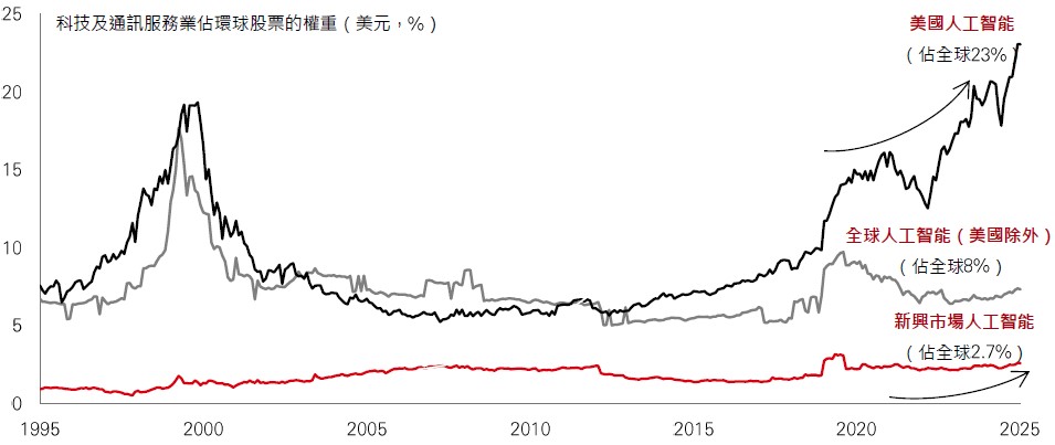 人工智能的凌厲升勢在2025年推動了投資市場,其中美國科技和通訊服務股錄得卓越利潤增長,帶動市場屢創新高。由於估值急升,單計此兩大美國行業的市值,便佔現時所有環球股票市值近四分之一。