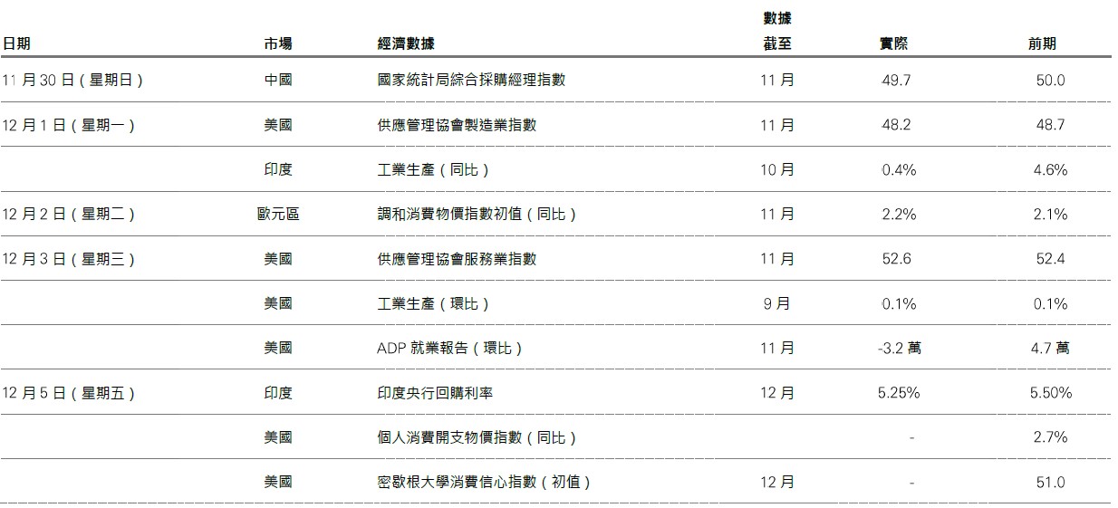 資料來源:滙豐投資管理。數據截至2025年12月5日(英國時間上午7時30分)。僅供參考,不應視為投資特定國家、產品、策略、行業或證券的建議。所表達的任何觀點均截至編製為止,如有更改,恕不另行通知。所提供的任何預測、預計或目標僅供參考,概非任何形式保證。滙豐投資管理對未能達到該預測、預計或目標,概不承擔任何責任。美國政府停擺終結,但預期官方數據公布仍有機會推遲