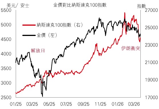 金價走勢自伊朗衝突爆發以來,與市場原先預期有所出入。按傳統邏輯,地緣政治緊張及經濟不確定性上升,理應推高金價——就如去年「解放日」期間的走勢,並有望延續過去兩年的強勁升勢。然而現實卻截然不同:金價月初至今下跌約15%。