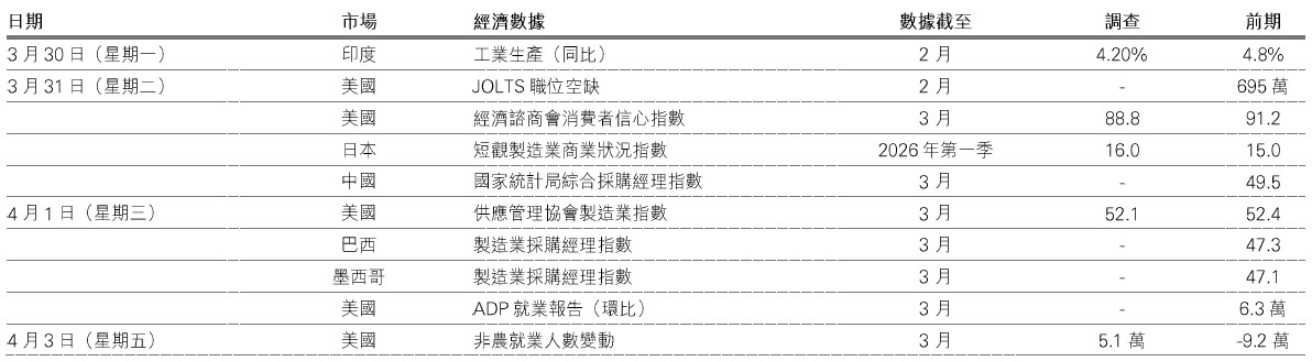 過往表現並非未來回報指標。息率水平不獲保證,日後可升或可跌。僅供參考,不應視為投資特定國家、產品、策略、行業或證券的建議。多元化並不能確保盈利或防止虧損。所表達的任何觀點均截至編製為止,如有更改,恕不另行通知。指數回報假設所有分派再投資,不反映費用或開支。您不能直接投資於指數。所提供的任何預測、預計或目標僅供參考,概非任何形式保證。資料來源:滙豐投資管理、Macrobond及彭博。數據截至2026年3月27日(英國時間上午7時30分)。