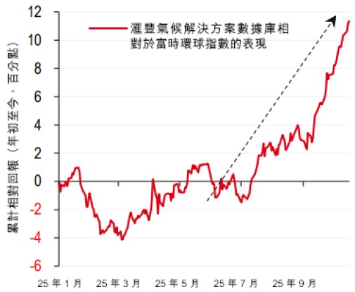 從滙豐環球投資研究(「滙豐研究」)專有的「滙豐氣候解決方案數據庫」[@why-esg-matters-04-01] (HCSD) 中可以看到,全球氣候類股票在今年第三季度價格走勢強勁;截至 10 月 16 日,其 2025 年表現較環球股票基準(富時環球指數)高出 11.4 個百分點[@why-esg-matters-04-02] 。此前數年,氣候類股票始終保持跑贏大盤的穩健表現,2024 年的漲幅更是達到 15.4 個百分點。
