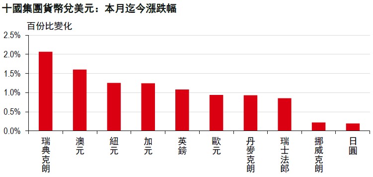 進入12 月以來,瑞典克朗的表現領先十國集團貨幣,澳元、紐西蘭元及加元緊隨其後(詳見下圖)。這一趨勢反映出美元兌十國集團貨幣普跌(請參見《外匯前瞻快訊:美元:聯儲局第三次減息0.25%,並提供中性指引》瞭解詳情)。