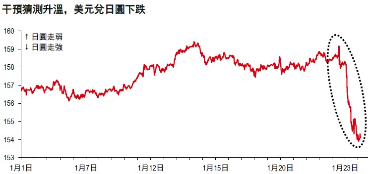 上週五美股交易時段,有報導稱紐約聯儲代表美國財政部進行了匯率詢價(《紐約時報》,1 月23 日),美元兌日圓隨後大幅下跌。此前,在日本央行行長植田和男(Ueda Kazuo)新聞發佈會期間,美元兌日圓一度大幅上升;隨後,日本財務大臣片山皋月(Katayama Satsuki)發表講話,強調日本政府正對外匯市場動態保持高度警惕(彭博資訊,1 月23 日)。鑒於日本和美國當局在數星期前已強調雙方對日圓走勢的共同關切(彭博資訊,1 月13 日;美國財政部1 月14 日發佈的會議紀要),此次匯率詢價顯示,短期內出現聯合干預的可能性正在上升。