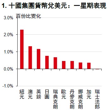 過去一周,受特定國內因素的推動,紐元在十國集團貨幣中表現最強,澳元和英鎊緊隨其後(圖1)。