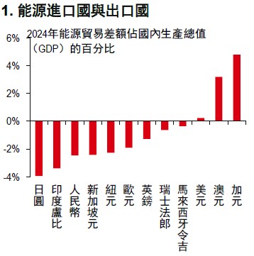 石油和天然氣價格上升,削弱了日圓、瑞士法郎等貨幣的傳統避險支撐,同時對能源淨進口需求較大經濟體的貨幣構成更大壓力(圖1)。在美元走強的環境下,僅有加元、澳元等少數貨幣有望表現堅挺。