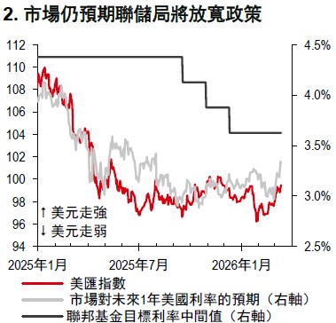 與2022 年不同,此前推動美元結構性走強的兩大核心支柱,包括(1)美國聯邦儲備局(簡稱「美聯準」或「聯儲局」)立場明確偏向鷹派以及(2)全球經濟增長持續走弱,目前均不存在。市場仍在預期聯儲局今年傾向於逐步減息(圖2),而領先指標則指向更為穩固的全球經濟增長前景。這些因素共同作用,有望為週期性貨幣提供支撐,並抑制美元全面走強,也支持我們的核心觀點:若地緣緊張局勢緩和,美元將重回走弱態勢。不過,若衝突導致市場大幅重估聯儲局政策路徑,並轉向加息預期,則美元仍傾向於上行。