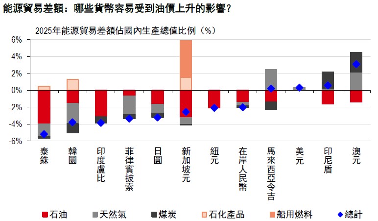 最終,油價走勢將在決定匯率走向方面發揮關鍵作用。霍爾木茲海峽(the Strait of Hormuz)是一個關鍵敏感點,全球約19%的石油運輸都從這裡經過。任何中斷都可能對外匯市場產生重大影響,尤其是主要石油淨進口國的貨幣(如下圖所示)。相反,地緣政治緊張局勢的緩和可能會導致美元回吐近期的升幅,因為支持美元走軟的基本因素並未改變。